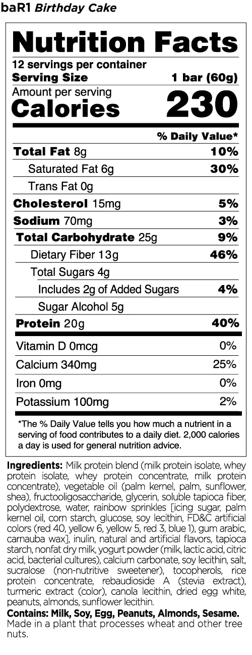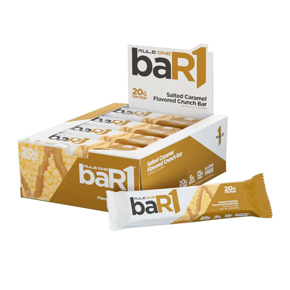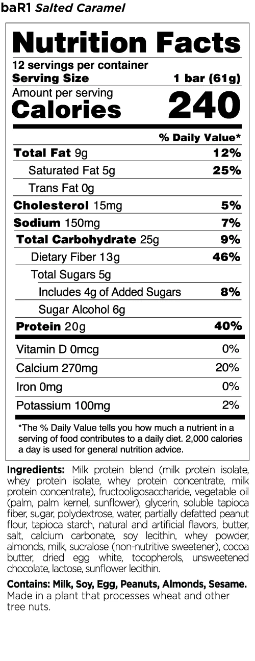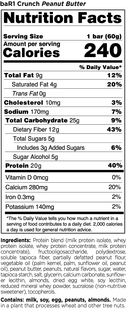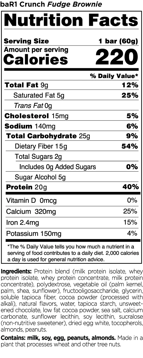 R1 Bar1 Crunch Highlights:Â Thick and crunchy, each baR1â„¢ Crunch Bar contains no more than 8g of net carbs while delivering 20g of protein. R1 raises the bar with great taste and sensible, hunger-quashing nutrition.