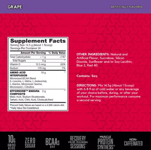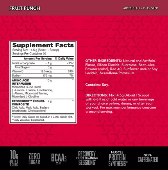 - 10g of micronized BCAAs and the essential amino acids L-Alanine, Taurine and L-Citrulline per serving.
