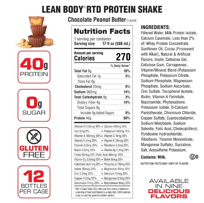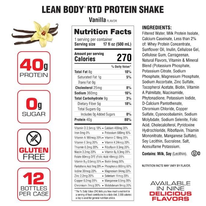 Labrada Lean Body Protein Shake RTD Highlights: To many people, a “Lean Body” means better health, more energy, strength, and an improved sense of well being. Whatever goal drives you, Lean Body® Ready-to-Drink (RTD) Shakes can help you reach it. Lean Body® RTDs provide high-quality protein without sugar or gluten. The protein in Lean Body® RTDs provide nutritional support for lean muscle in a convenient shake with a delicious, creamy taste that hits the spot every time.