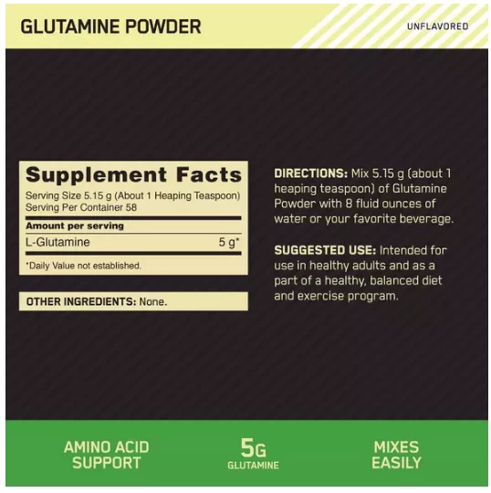 Optimum Nutrition Glutamine Powder Highlights: Glutamine is the most abundant amino acid in the body, comprising more than 60% of the free amino acid pool in skeletal muscle and greater than 20% of total circulating amino acids. During prolonged, intense exercise, muscle glutamine levels may be depleted, and this can limit protein synthesis.¹ Glutamine Powder is an easy way to supplement your diet. This instantized powder mixes easily and is unflavored for ‘stacking’ with protein shakes.