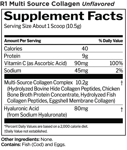 R1 Multi-Source Collagen Highlights: Made from a variety of food-based sources, Multi-Source Collagen™ provides broad support and nutritional building blocks for a variety of different structural and connective tissues.
