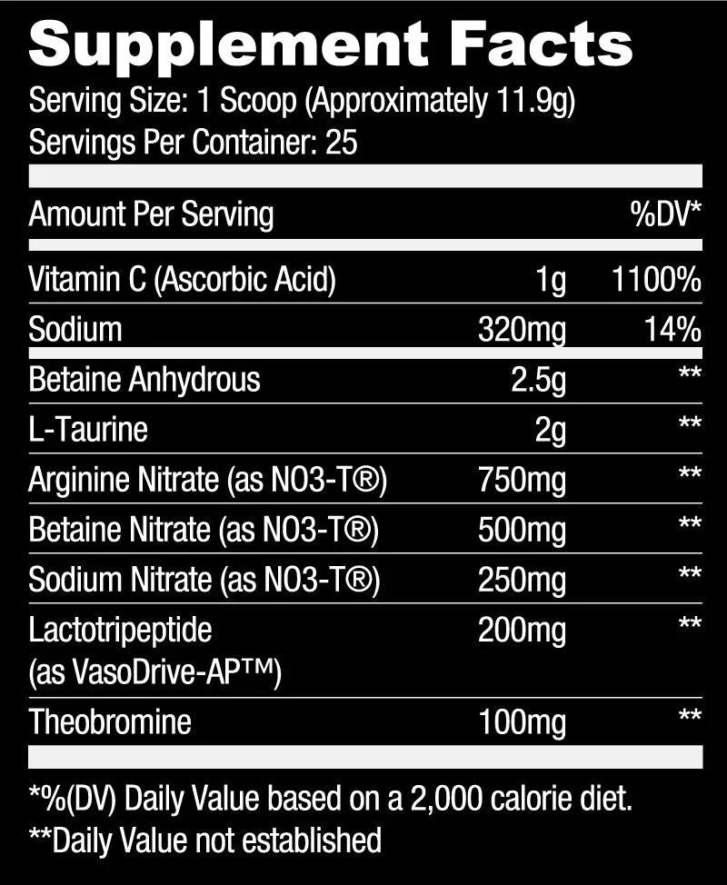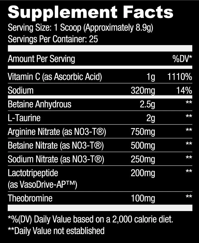 - 1.5g Patented NO3-T Nitrate Formula with 3 patented blends to promote maximum vasodilation for skin tearing pumps.